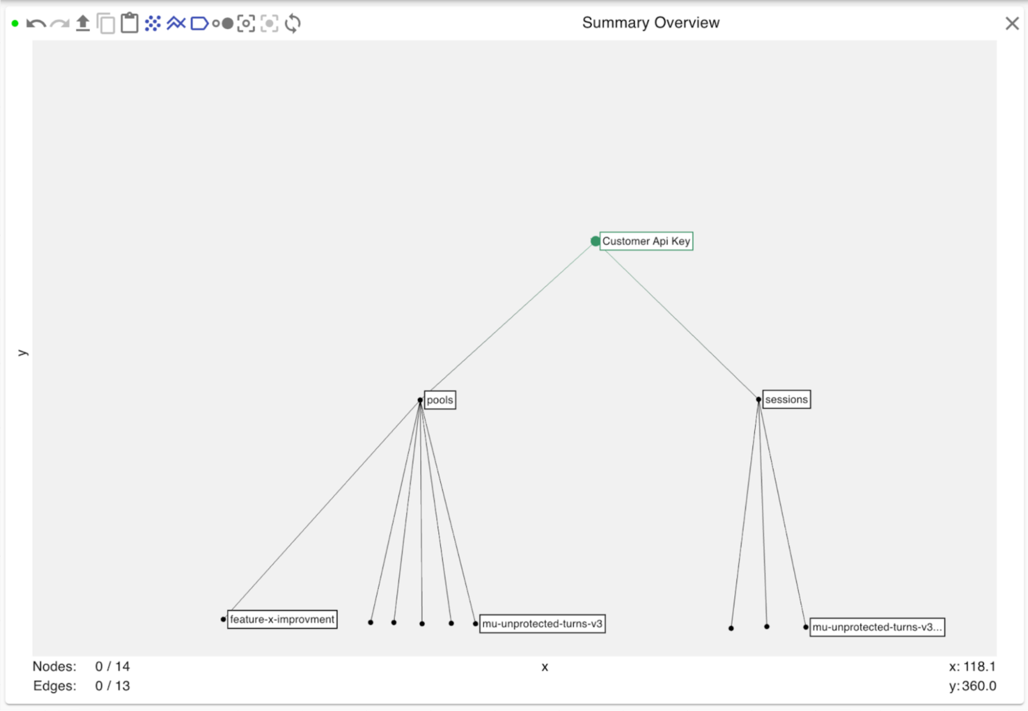 The Api Key is usually located at the centre of your Summary Overview. This node is unique to each user account, whether it be a company-wide account or individual user within an organisation, and acts as a header node to all data available to that account. As such, it should help you navigate quickly to the subset of the graph that is relevant to you.